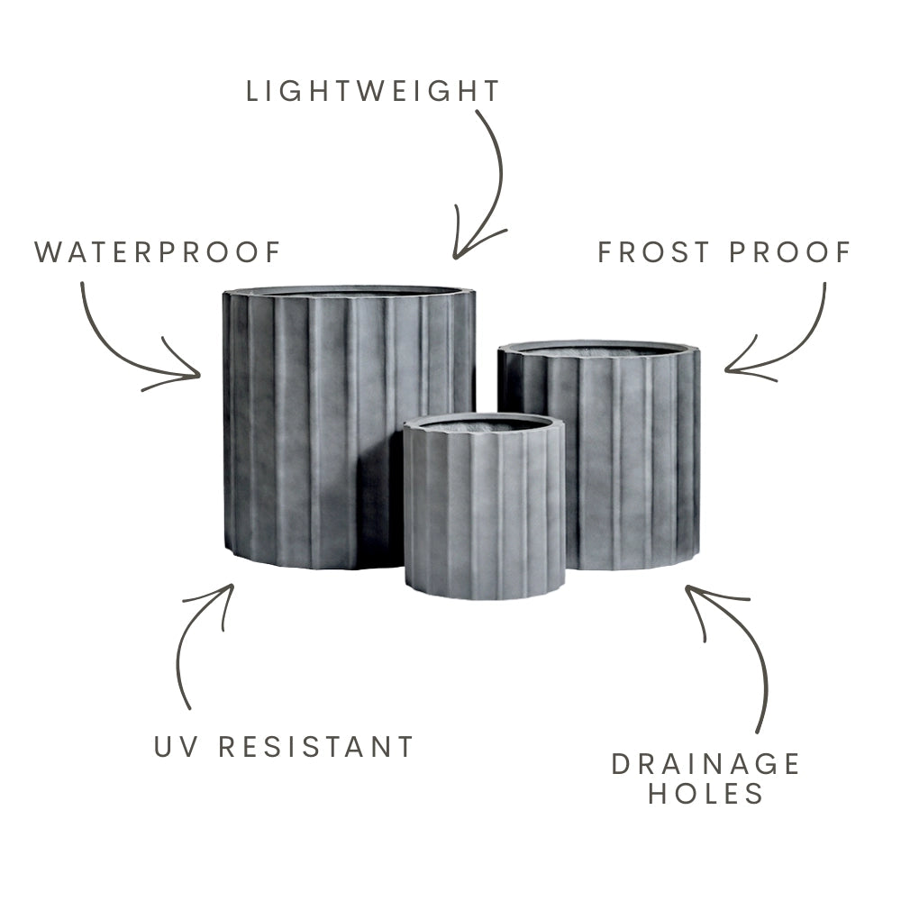 Cette collection contemporaine de pots est fabriquée à partir d’un mélange composite léger, ce qui les rend extrêmement résistants et adaptés aux intempéries. Lisse et élégante, la gamme Willow est disponible en trois couleurs et chaque pot possède deux trous de drainage.